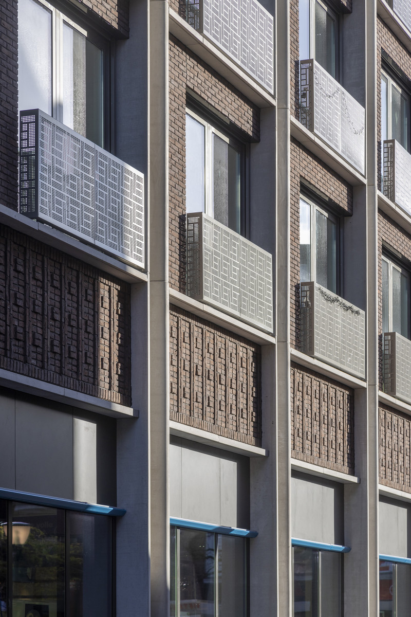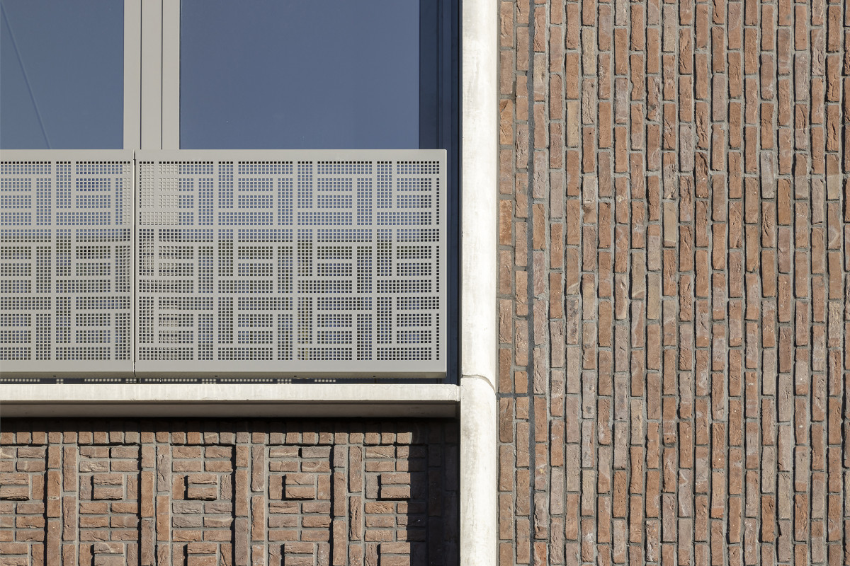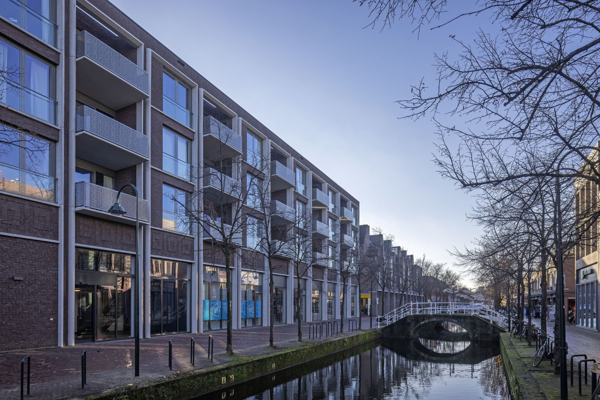 Voor het gevelontwerp hebben we ons laten inspireren door de Delftse gracht, waarbij we de meest typerende eigenschappen van de grachtenwand hebben vertaald naar een aantal richtlijnen, zonder daarbij letterlijk terug te grijpen op het verleden. Grachtenpanden in Delft worden gekenmerkt door een duidelijk gevelbeeld met een plint, een opbouw en een lijst, door een zekere mate van verticaliteit, en door een contrast tussen baksteen en ‘witwaarde’, met materialen als natuursteen of beton. Dit hebben we vertaald naar een abstract, reliëfachtig raster dat het bouwblok vorm geeft en leesbaar maakt; dit raster dient als een basisstructuur waarbinnen de verschillende elementen - balkons, winkelpuien, kozijnen, dichte gevelvlakken, expeditie-ingangen - hun plek kunnen krijgen. U-vormige witte betonnen kaders zorgen voor een verticale dubbele belijning die de contouren van het raster benadrukt. De ruimtes hiertussen zijn ingevuld met staand halfsteens metselverband, terwijl de horizontale betonnen banden terugspringen ten opzichte van de verticale banden; zo krijgt de ‘verticaliteit’ in de gevel meer nadruk. Het raster laat zich lezen als een abstracte interpretatie van de Delftse grachtenwand, een schakeling van vooruitspringende en terugliggende vlakken die doet denken aan de reliëfs van de Delftse kunstenaar Jan Schoonhoven. Zo komen ook hier verschillende schalen samen.