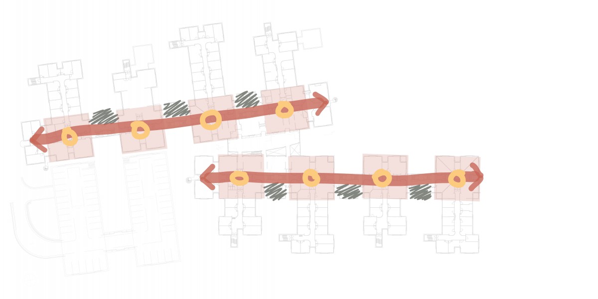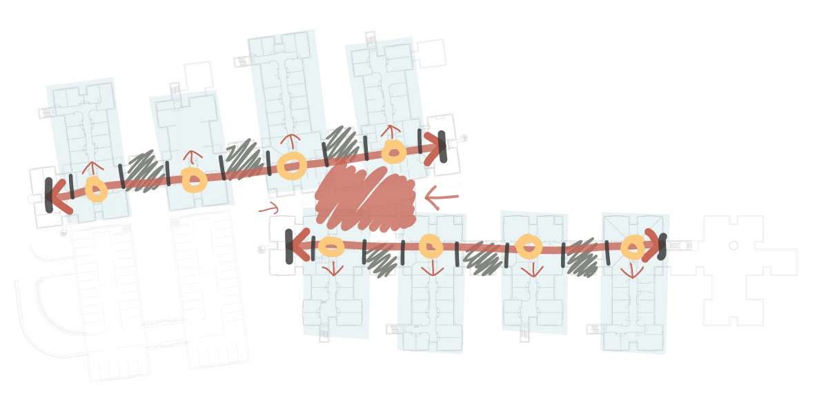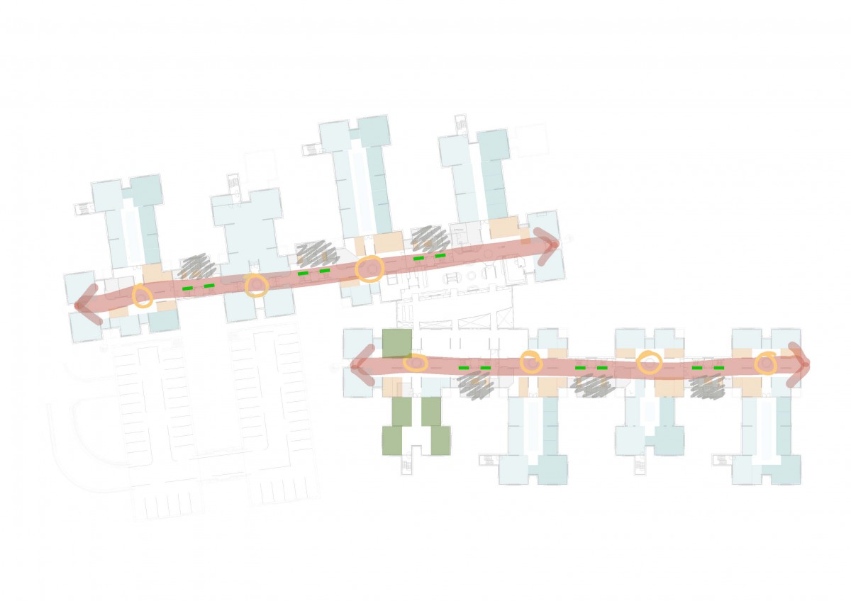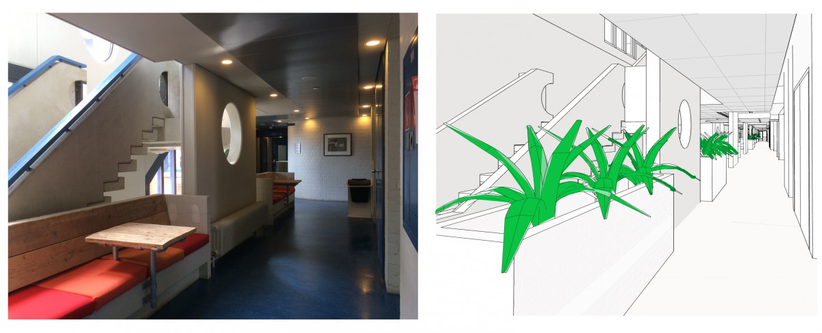 Ondanks de logische structuur is het gebouw nu niet heel overzichtelijk. De functionele tussenzones zijn zodanig afgesloten dat er geen zicht is op waar je naar toe loopt. Als medewerkers geen vaste werkplek meer hebben wordt goede oriëntatie essentieel. Zij dienen gemakkelijk hun weg te vinden, ook in delen van het gebouw waar ze niet regelmatig komen. Wij hebben daarom in ons projectvoorstel de centrale as verbreed en opengemaakt door de halfronde binnenwanden te verwijderen. De gangzone naast de trappen loopt door en geeft de gebruiker (door)zicht over het hele gebouwdeel.