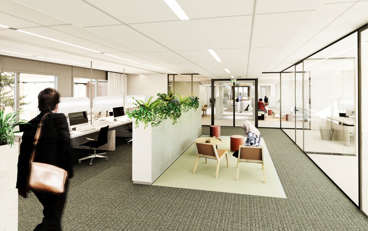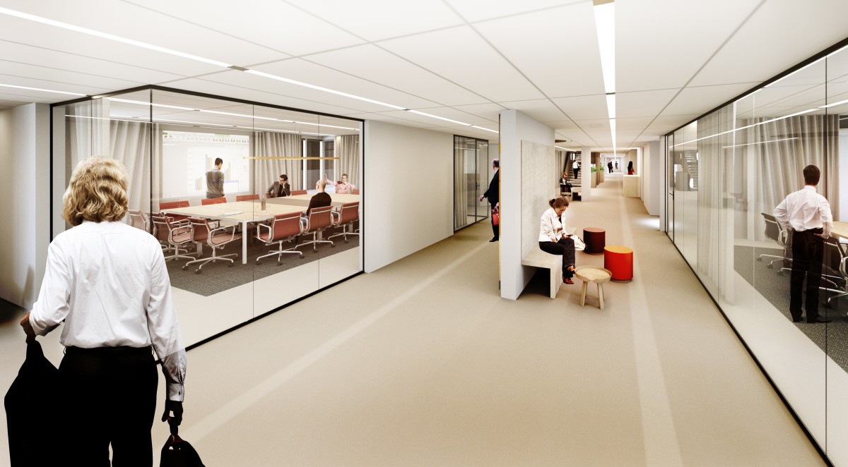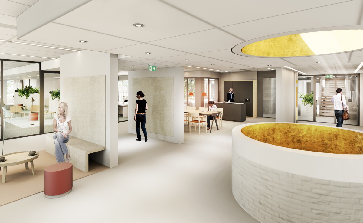 In het kantoorgebied speelt het ontmoetingsgebied met zogenaamde ‘ankerpunten’ een belangrijke rol. Plekken waar het prettig en logisch is om elkaar te treffen en te informeren. Deze zijn evenredig verdeeld over het kantoorgebied daar waar de centrale as de kantoorvleugel kruist, aan de entree van het werkgebied. De ronde vide met natuurlijk daglicht versterkt nog de ontmoetingsfunctie. In de kantoorvleugels liggen de werkgebieden ingericht met activeiteitsgerelateerde werkplekken.