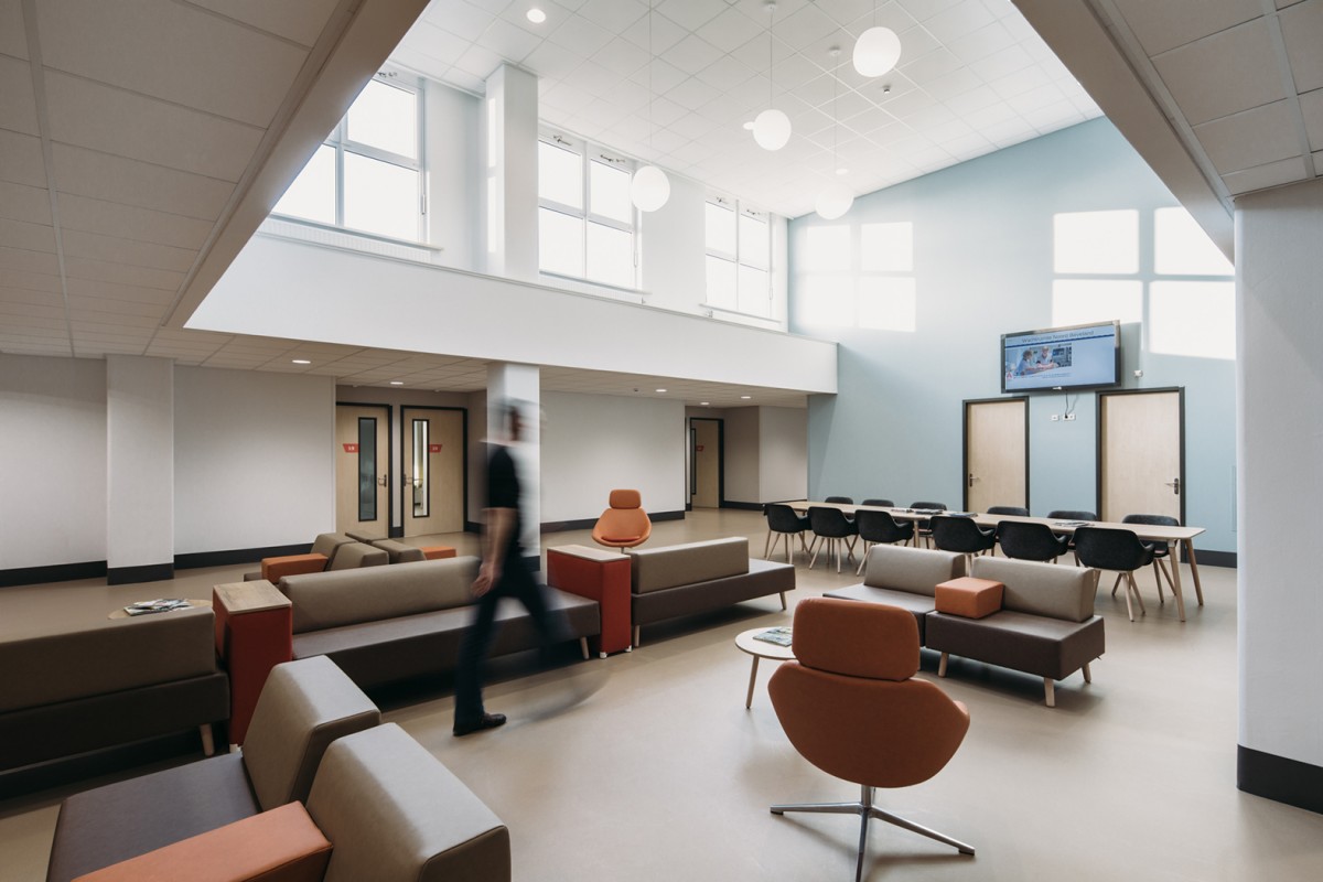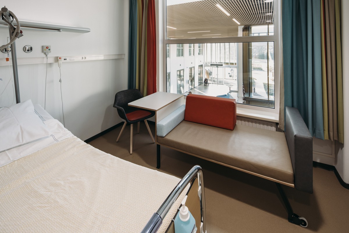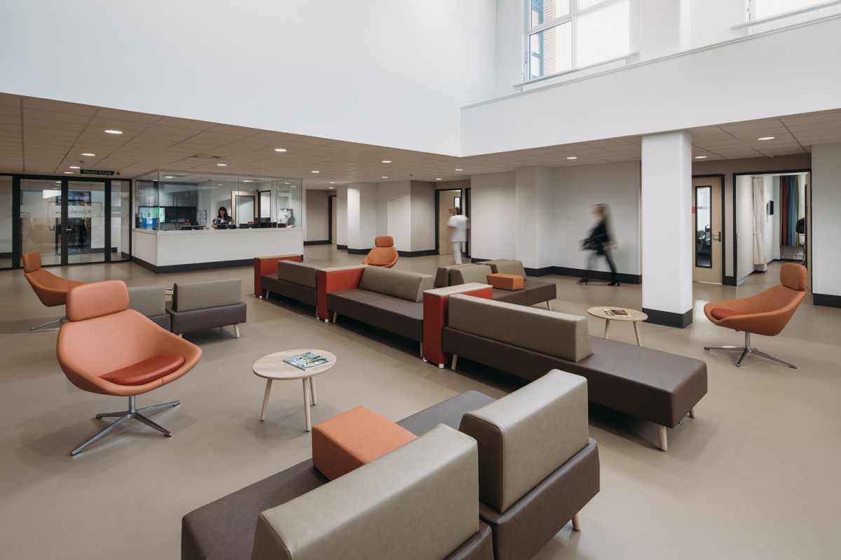 De grote glasoppervlakken zorgen voor veel daglicht, zelfs tot midden in de vernieuwde beddenafdeling. De nieuwe tuin in de oorspronkeijk patio geeft niet alleen een prettige sfeer, maar speelt ook een rol bij de oriëntatie binnen. Vanaf de centrale ontmoetingsplek zijn voor zowel de patiënten als de bezoekers alle afdelingen op een eenvoudige en prettige manier te bereiken.
