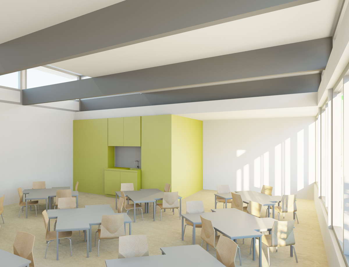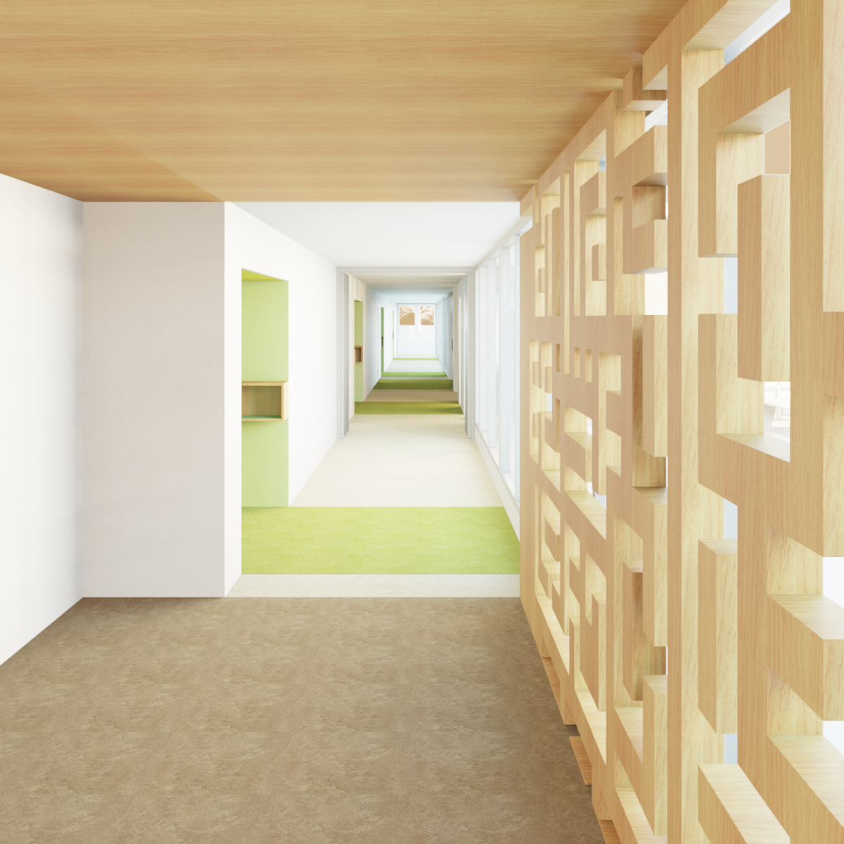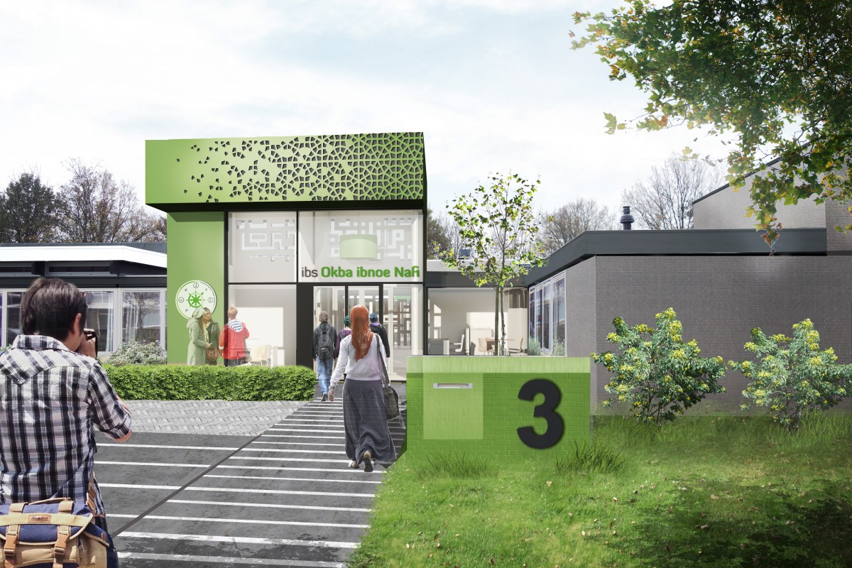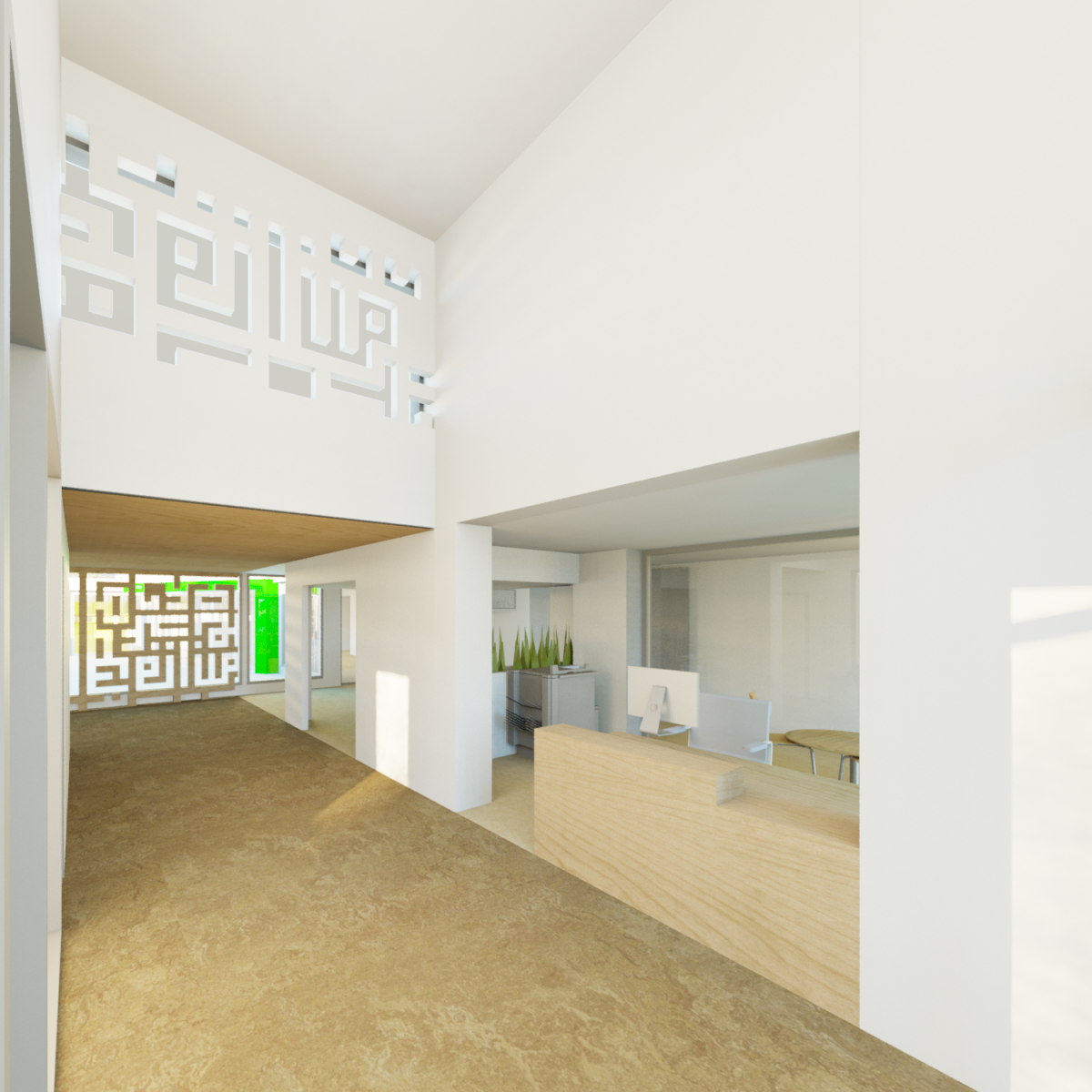 Belangrijke ingreep is het introduceren van een as die entree, gebedsruimte en patio met elkaar verbindt. De groene loper. Deze zone begint vanaf de stoep in de vorm van bestrating, neemt het bestaande brievenbuselement mee en de entree wordt getransformeerd tot een karakteristiek beeldbepalend volume. Hierin ligt onder andere de nieuwe entree en wordt je blik, op de plaats van de patio pui, vastgehouden door een fraai scherm. Vanaf hier kun je kiezen naar welk lokaal je gaat en kijk je verder naar de patio en de gebedsruimte. Voor het entreevolume is de kleur groen gekozen. Groen is eveneens de accentkleur in het interieur. Rust voert de boventoon in het interieur en is vertaald naar het gebruik van veel wit, met groene accenten en hout accenten.
