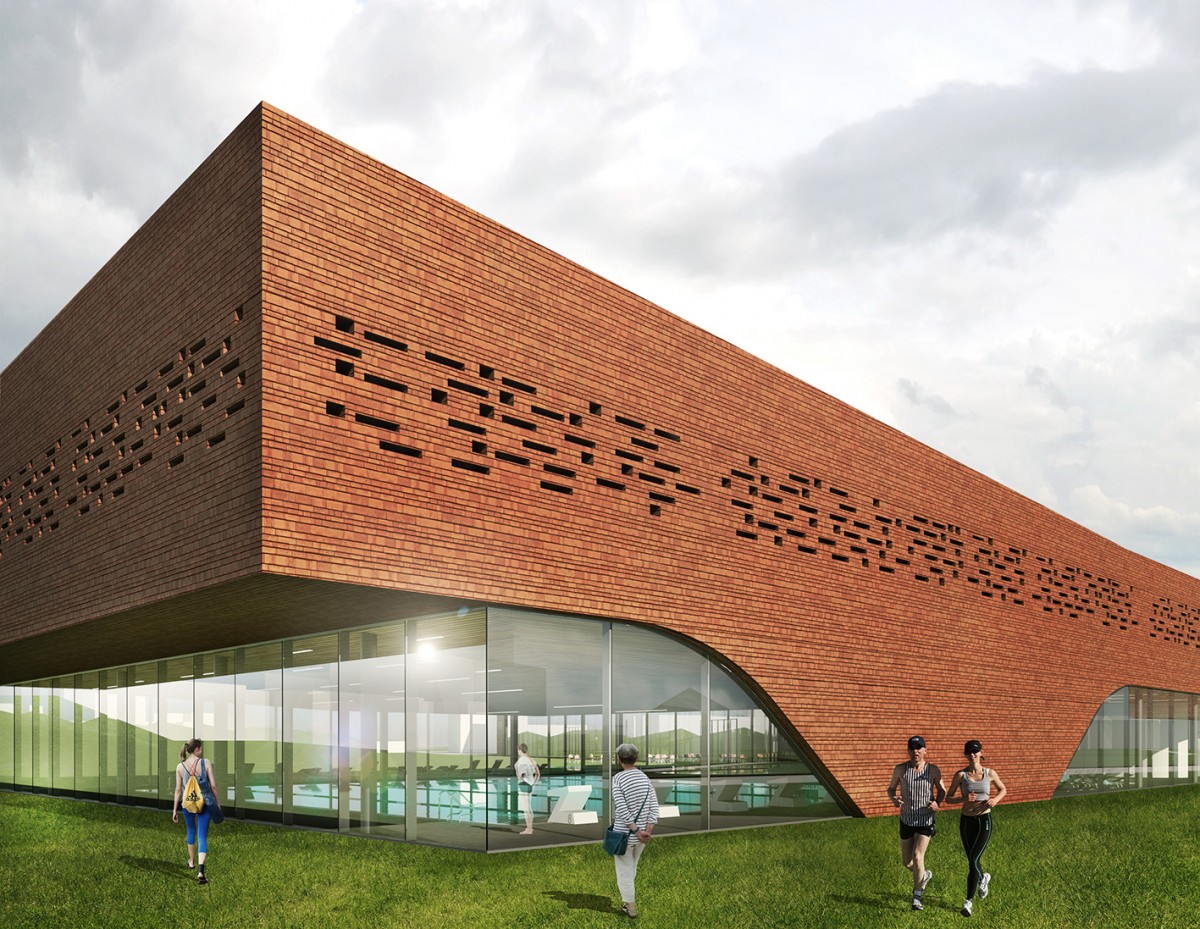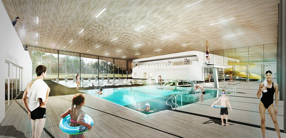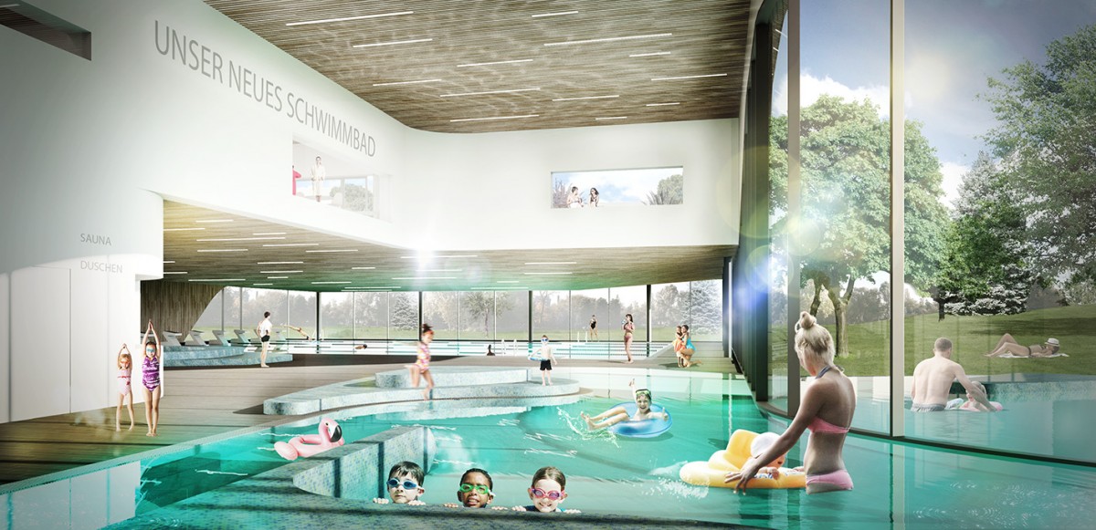 Wie ein Pavillon fügt sich das neue Schwimmbad durch seine geschwungenen Formen in die Landschaft ein. Die Hauptschwimmeinheiten werden durch die Erhöhung des Daches erkennbar gemacht. Der Besucher wird jeweils von den höchsten Punkten des Gebäudes entlang der geschwungenen Fassade zum Eingang geleitet, welcher durch eine Auskragung des Obergeschosses betont wird.