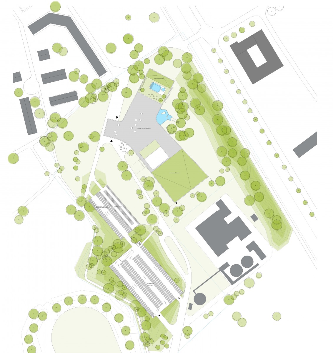 Auch aus westlicher Richtung ist das Grundstück ausschließlich von Fußgängern und Fahrradfahrern aus den umliegenden Wohngebieten bzw. den Haltestellen des öffentlichen Nahverkehrs kommend erreichbar. Ein gut ausgebautes Netz aus Fahrradwegen sorgt für einen direkten und schnellen Zugang aus dieser Richtung zu dem Grundstück. Der Besucher durchquert den Park, der eine Verlängerung des Wasserlandparks ist und kann das Eingangsfoyer schon von weitem erkennen. Mit einem großzügigen Vordach empfängt das Schwimmbad hier seine Besucher in einem hellen Foyer.
