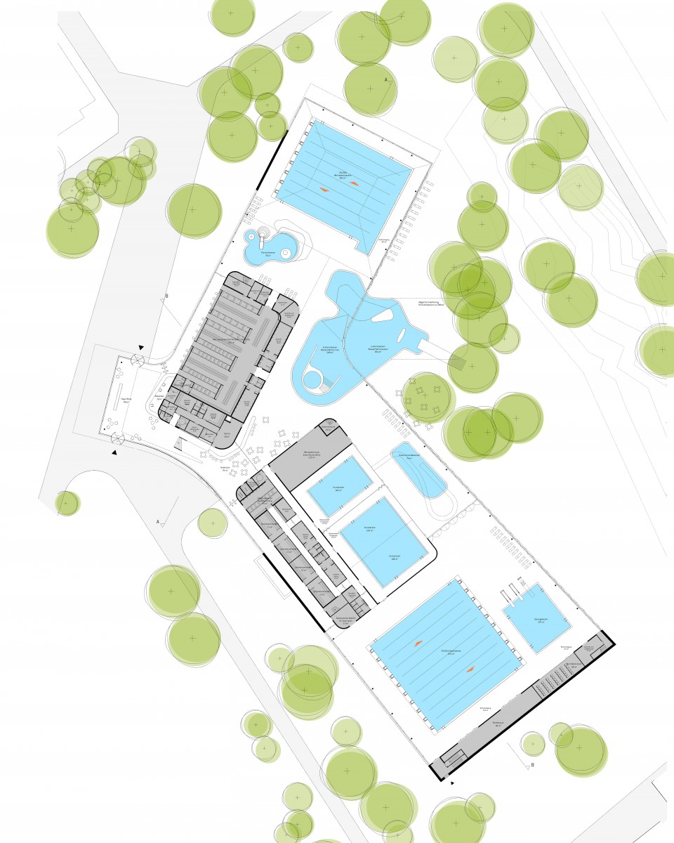 Das Grundstück, auf dem das neue Bonner Schwimmbad entsteht, grenzt an eine Grünstruktur, in der eine der größten Bonner Sportstätten, das Wasserlandstadion liegt. Ziel ist es, diese innerstädtischen grünen Freiflächen zu erhalten und mit einer neuen Sportstätte auszubreiten und aufzuwerten. Vorhandener Baumbestand soll weitestgehend erhalten bleiben. Das Gebäude ist eingebettet in den Park, von allen Himmelsrichtungen leicht zugänglich. Das neue Schwimmbad schmiegt sich durch seine Form und Lage auf dem Grundstück in diese Landschaft ein.