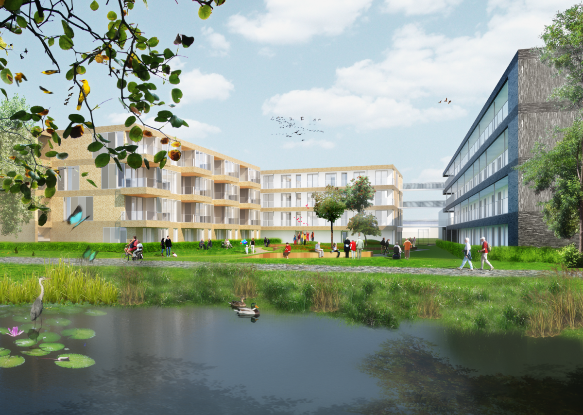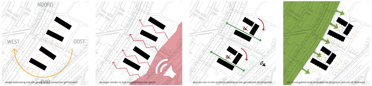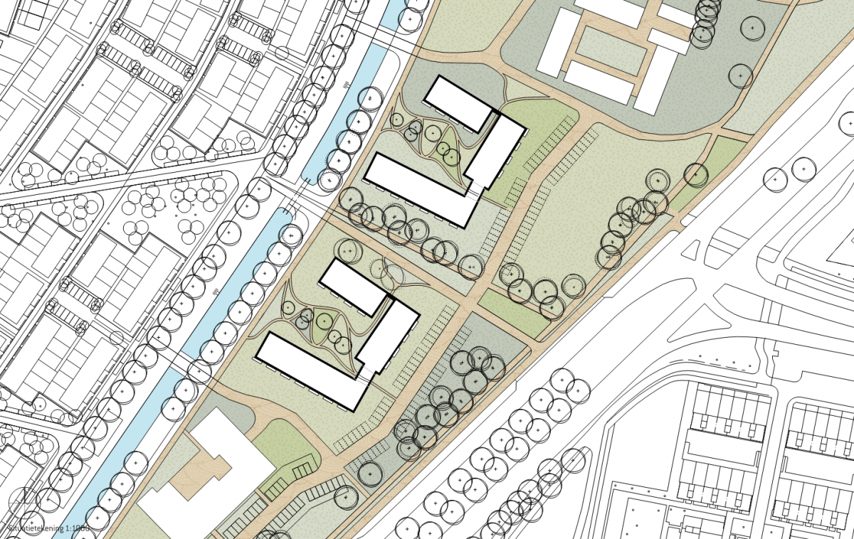 Tussen de blokken is ruimte voor een parkachtige inrichting met wegen aan de buitenkant (vormgegeven als langzaam verkeerroute) en met het parkeren in een lange strook in de bomenzone parallel met de Groene Kruisweg. De hoofdentrees van beide blokken grenzen daaraan, evenals de bergingen op de begane grond. Het U-vormige blok bestaat uit een ensemble van drie vleugels. De vleugels staan los van elkaar waardoor er geen complexe hoekoplossingen nodig zijn. Ze worden verbonden door galerijen. De gekozen afstanden en de lichte verdraaiing van het langgerekte zuidwestelijk vleugel leveren een spannende binnenruimte. Dit middenveld is voor collectief gebruik: groen en verblijfsgebieden.