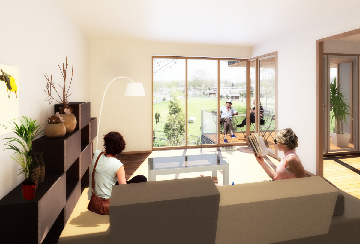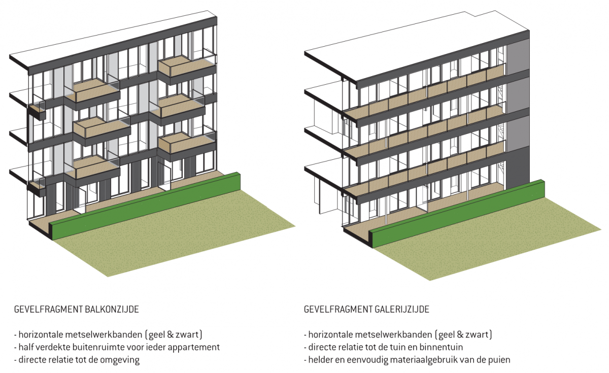 De voorgestelde woningen zijn zowel voor ouderen als kleine gezinnen geschikt. Ze zijn met opzet generiek gemaakt. Het basistype bestaat uit een drie-kamer woning waarbij hoofdslaapkamer en woonkamer aan de balkonzijde zijn gesitueerd. Een royale eetkeuken bevindt zich aan de galerijzijde. De suggestie wordt gedaan de ruimtelijkheid van de woning te vergroten door het gangbare gangetje na de voordeur te laten vervallen. Zo ontstaat bij binnenkomst een grote eetkeuken die kan worden afgesloten van het wonen. De badkamer is vanuit de hoofdslaapkamer bereikbaar. Het woningtype (een 3kamer woning van 83 m2 GBO exclusief de buitenberging) is overal toegepast. De woning kan met dezelfde verticale verbindingen, schachten en meterkast worden toegepast ook in een variant waarbij een ruime eetkeuken keuken zich naast de woonkamer bevindt aan de balkonzijde. Een 4kamer woning is ook mogelijk. De woningtypen zijn onderling uitwisselbaar, zodat ingespeeld kan worden op individuele woonwensen. De woningen op de begane grond zijn 85m2 GBO omdat daar de terrasgevel is rechtgetrokken.