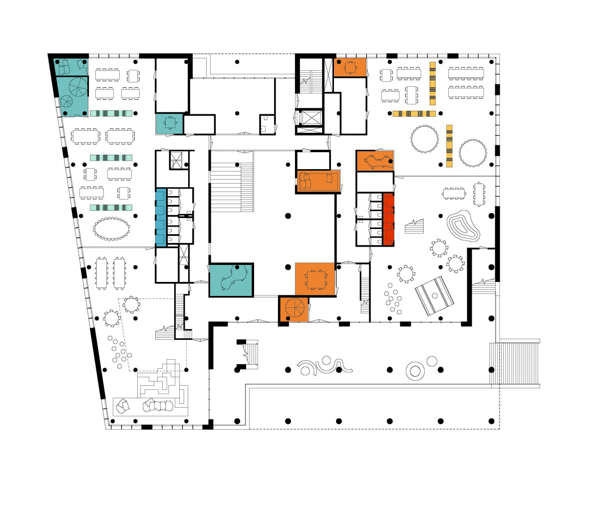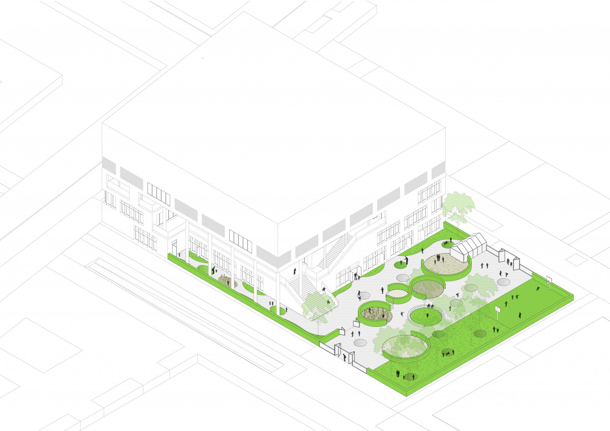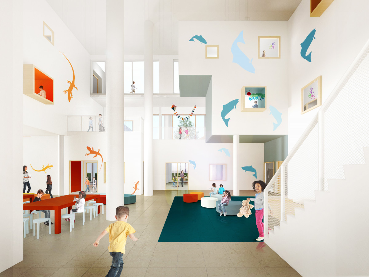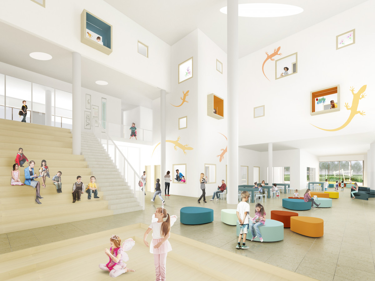In het projectvoorstel worden de scholen en de wijkfuncties maximaal maaiveld gebonden georganiseerd. Naast de ruimtes voor de allerkleinsten, bevinden zich hier de refters, de kinderopvang, het handvaardigheidslokaal en de levensloopbestendige ruimtes die tevens door de buurt gebruikt kunnen worden. Ze zijn rondom het atrium gegroepeerd, dat het hart van blok 10 vormt. Het atrium fungeert, samen met de hoofdentree en centrale verticale hoofdstijgkern, als centrum van het project. Zowel de twee basisscholen, als de sportvoorzieningen en de lokalen voor voor- en naschoolse activiteiten zijn vanuit deze ruimte onafhankelijk van elkaar bereikbaar. Ook de verschillende buitenspeelruimtes (tuin op maaiveld, terrassen op eerste en tweede verdieping) zijn nadrukkelijk aan het atrium gelinkt en vanuit het atrium toegankelijk. Ook de door beide scholen gedeelde lokalen zoals refter, bewegingslokaal of slaapruimte en crealokaal bevinden zich rond het atrium. De interne sculpturale uitholling van het volume maakt van het atrium een ruimte op maat van kinderen. Deze krachtige en karaktervolle centrale ruimte is zodanig vormgegeven dat zij multi-interpreteerbaar en multi-inzetbaar is: als speel- en leerruimte voor de kinderen, als ontmoetingsruimte voor de ouders, als opvangplek voor de buitenschoolse kinderopvang met speelelementen.
