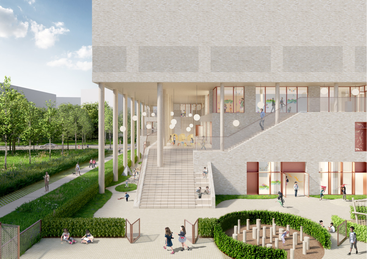 Voor de nieuwe Antwerpse stadsuitbreiding Nieuw Zuid hebben wij middels een Design en Build een ver uitgewerkt plan gemaakt voor ‘een leerlandschap van de toekomst met dubbele bassischool en sportprogramma’. Hier staan de verschillende nieuwe bewoners van Nieuw Zuid in de leeftijd van 0 tot 80 jaar centraal. De stedelijke context in combinatie met een zeer vooruitstrevende visie op de leeromgeving voor kinderen maken het tot een bijzondere opgave. Het nieuwbouwvolume fungeert als baken in de wijk, als vereenzelviging van een deel van het gemeenschapsleven.