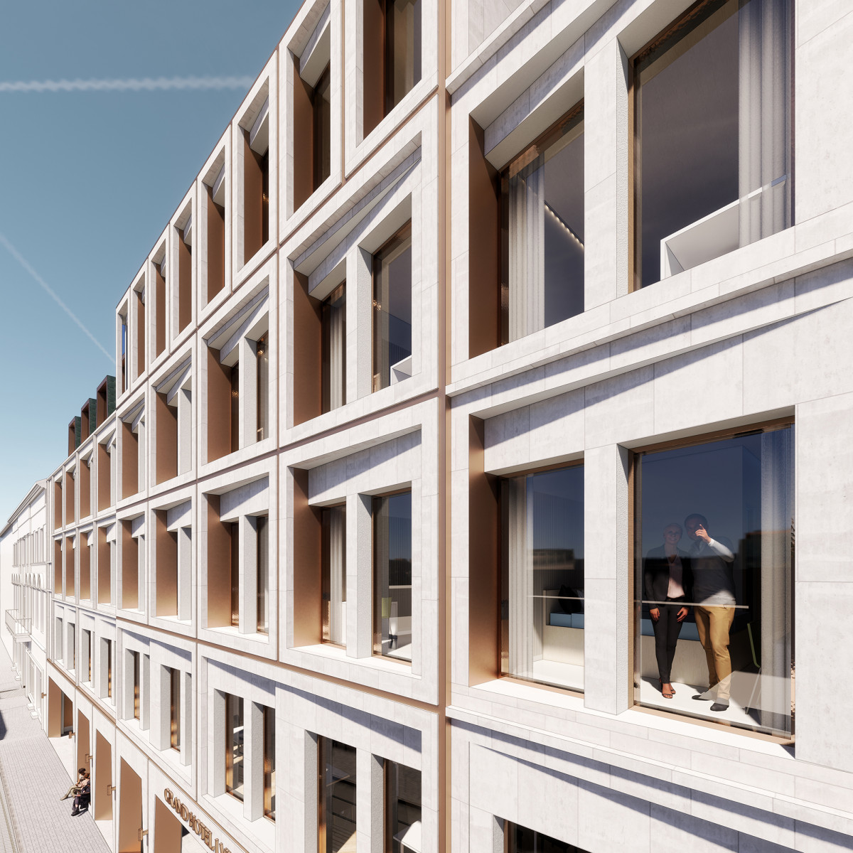 The façade has clear outlines defining the classical approach of the divine proportions by splitting it into three parts, clearly but subtly highlighted in order to create a more suitable scale in the streetscape. Subtle changes of depth and thickness of the individual elements create bigger emphasis in the central axis of the frontage, crowned by principal dormers. The tectonics create a playful game of light and shadow, changing throughout the day, as a modern revision of classical cornices, pediments, and porticos.