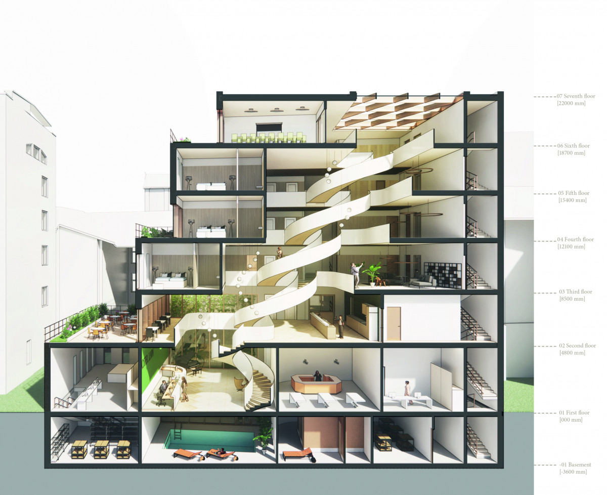The project creates a dialogue in the program and the public street life. It consists of three elements: the commercial plinth, the formal façade with the hotel rooms and the informal cascading interior part. The hotel requires 42 rooms, a new modern lobby space, restaurant, conference space, spa and supporting facilities. The combination of these requirements presented a challenge when creating 12 rooms along the Doroshenka Street while trying to create a façade within the scale of the neighboring buildings.