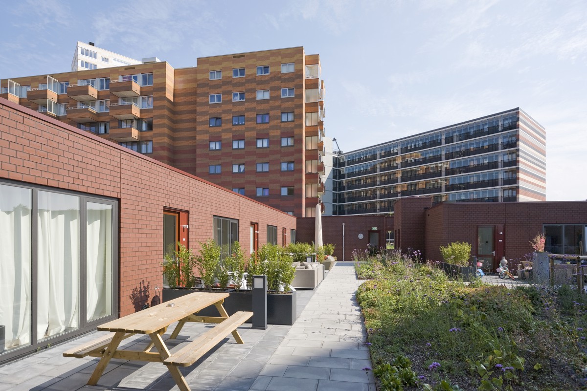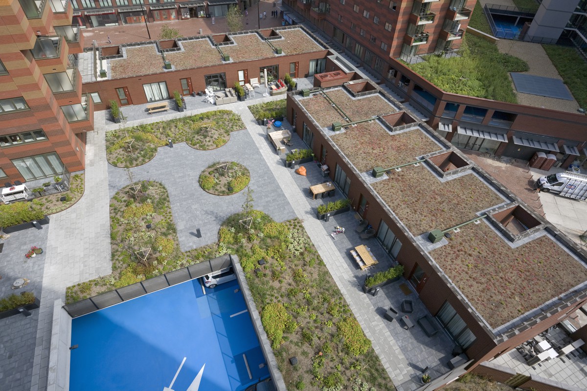 Het oude Waterlandplein in Amsterdam Noord is in een nieuw jasje gestoken. De Architecten CIE was verantwoordelijk voor het stedenbouwkundig plan, bestaande uit drie blokken van twee lagen die fungeren als plint voor nog eens negen hoge woonblokken van verschillende hoogte met een maximale hoogte van 66 meter. Binnen het plan ontwierp Hans van Heeswijk Architecten een nieuw uiterlijk voor de drie bestaande woontorens en de Architecten Cie vijf van de nieuwbouw torens. Atelier PRO is gevraagd, naast het ontwerp van de plint en één van de woontorens ook een ontwerp voor de daken van de lage bebouwing te maken. De daken hebben door afwijkende ligging en functie, verschillende invulling gekregen.