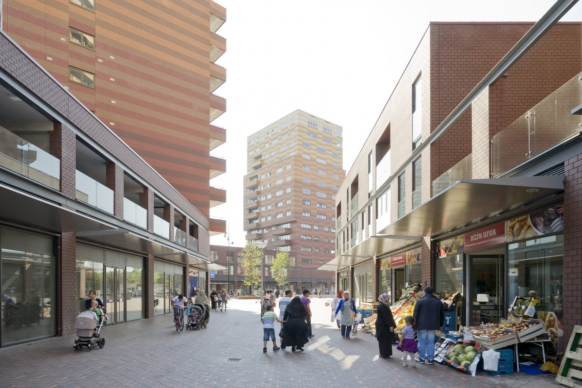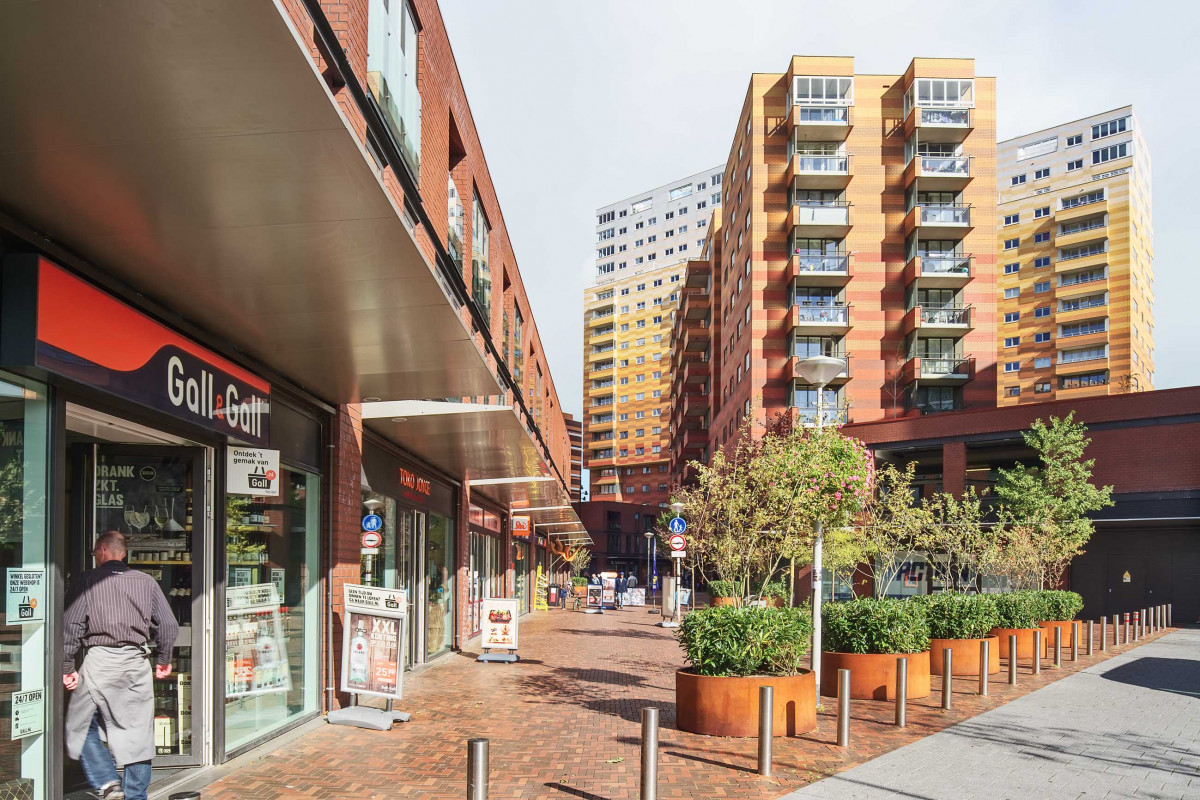 Uitdaging was een alzijdig centrum te maken dat, ondanks de verschillende bureaus die eraan werkten en grote variatie aan functies, samenhang heeft en herkenbaar is. Een ritme van in roodbruin metselwerk uitgevoerde penanten bepaalt het gezicht van het winkelcentrum op de begane grond. Het metselwerk vormt de lijst rondom de (winkel)puien en is daarom in kleur en materiaalgebruik neutraal gehouden. Door het toepassen van een extra dik formaat baksteen van 90 mm hoog, is de verhouding voeg-steen en daarmee de kleurintensiteit van het metselwerk gunstiger dan in een traditionele situatie.