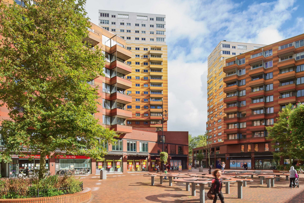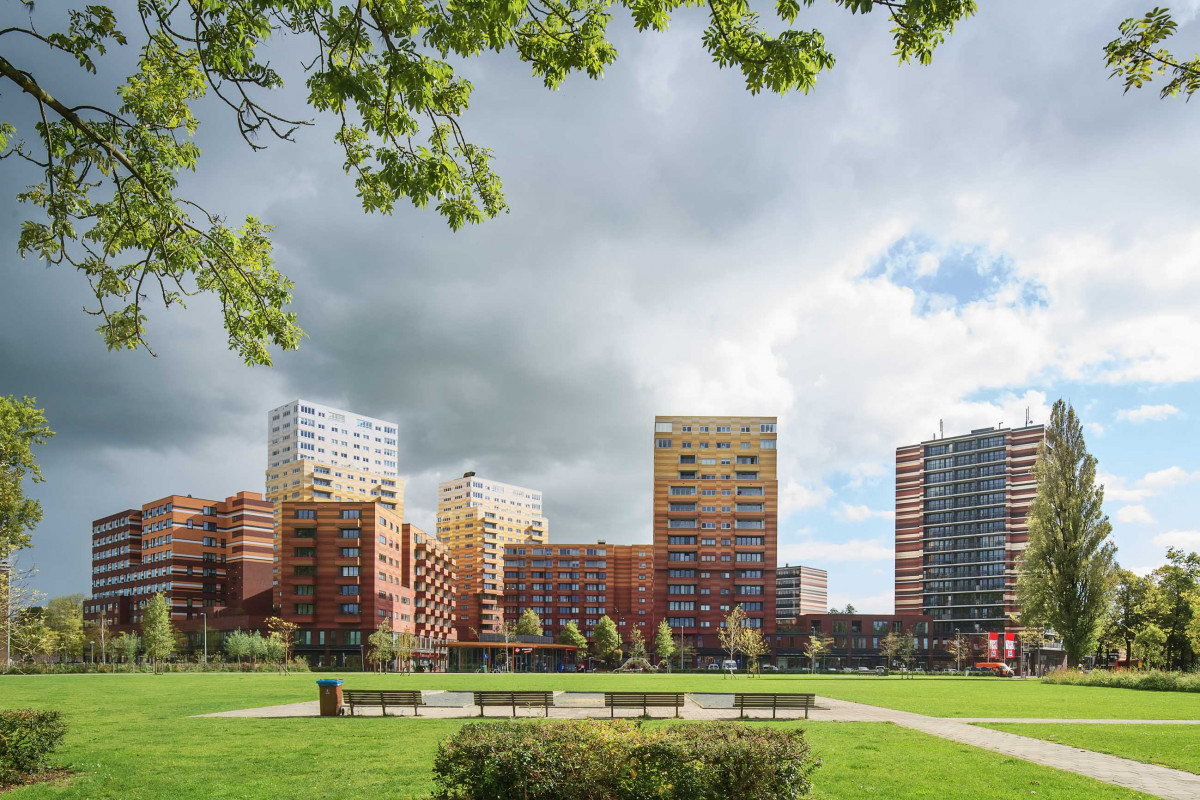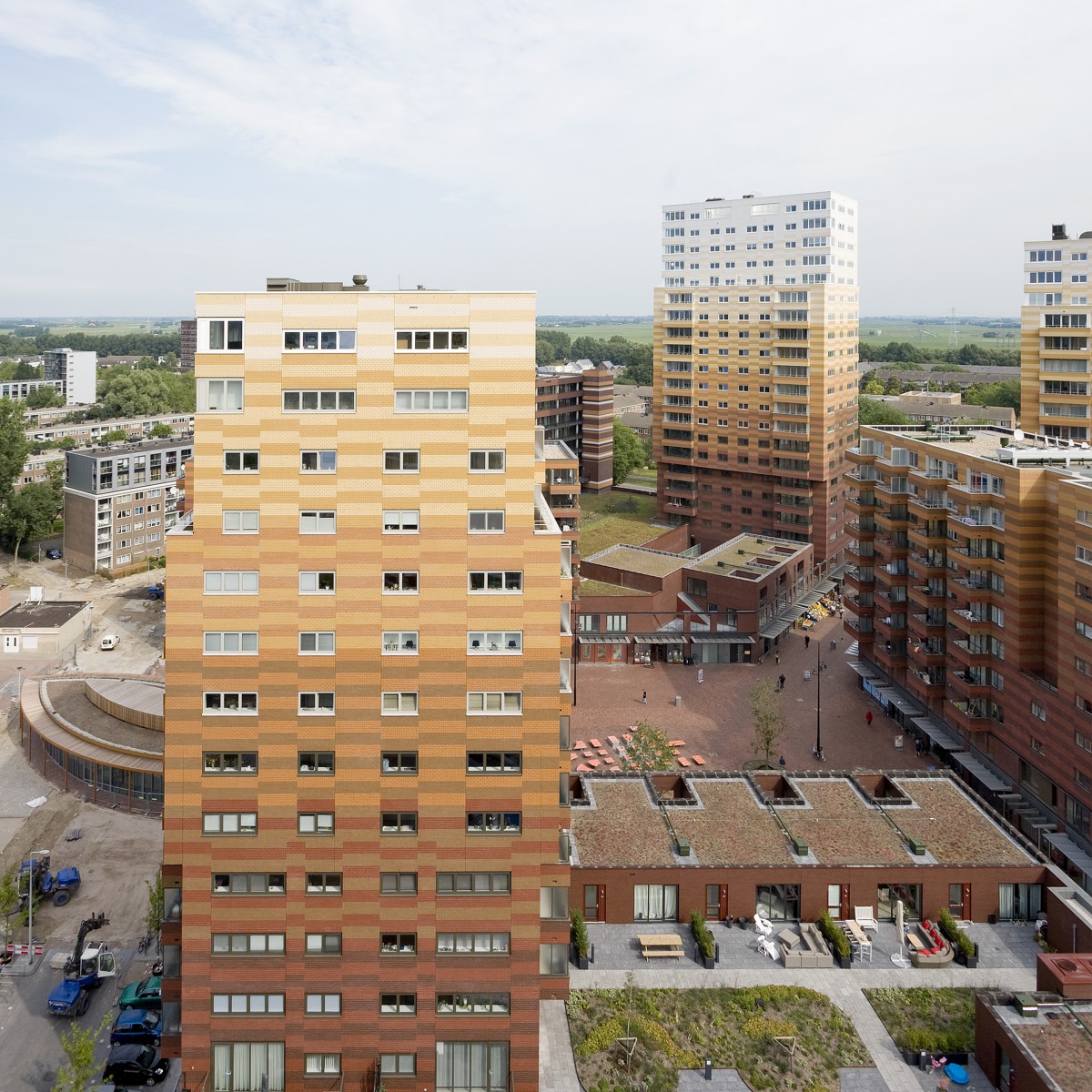 De torens staan niet op de plint maar rijzen eruit omhoog, veelal als samengestelde volumes. Kunstwerk en sokkel zijn geïntegreerd. Voor alle torens, oud en nieuw, is veelkleurigheid en horizontale belijning het uitgangspunt. De woontoren van atelier PRO huisvest op de 3 e tot en met de 9e verdieping sociale huurwoningen. Door de combinatie van de veranderende dichtheid van ramen en gaten enerzijds en het gekozen lijnenspel anderzijds, gaat de toren in de kopgevel een dialoog aan met de horizontaal gestreepte kopgevels van de renovatietorens. De langsgevels, zowel aan de galerijzijde als aan de voorzijde, zijn familie van de overige nieuwbouwtorens.